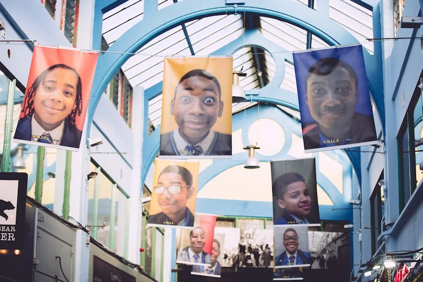 The end result of this was installations of portraits of boys from local secondary schools smiling to reframe and combat negative stereotyping of black boys. The portraits were hung prominently throughout Brixton Village and Hackney Bridge for the communities and visitors to see.