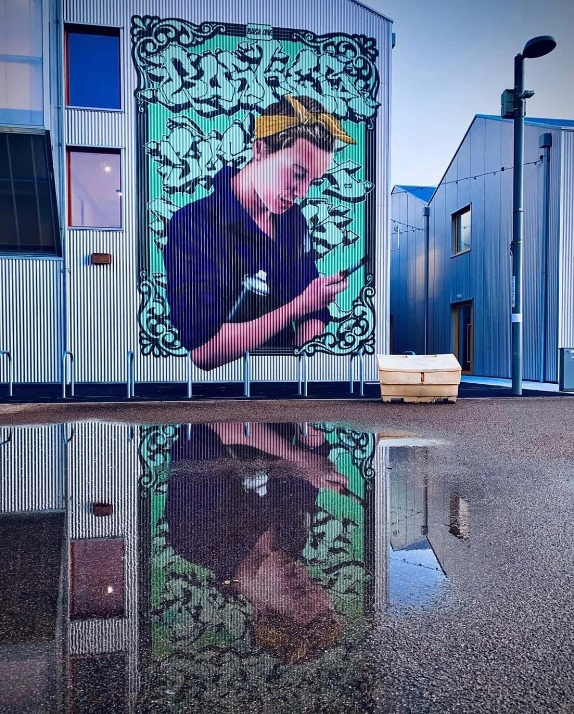 The piece is framed in a style similar to the adverts of the 1900s for Hackney Wick’s Clarnico Sweet Factory which stood on the site Hackney Bridge is located and was a key part of Hackney Wick’s industrial heritage. The design was inspired by the industrial history of the area, and celebrates the creativity of Hackney Wick today. It is a multidisciplinary piece bringing together both graffiti writing and muralism styles.