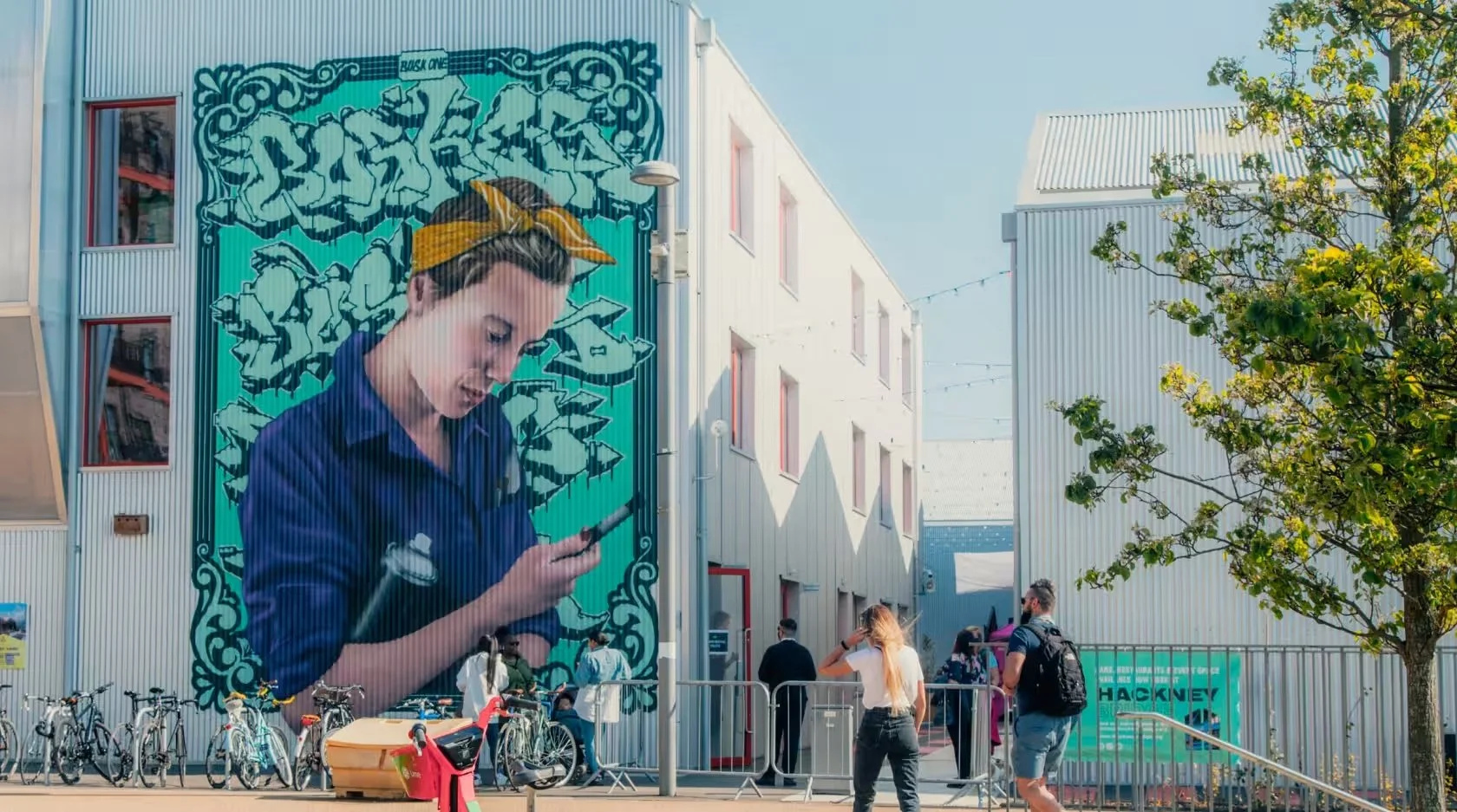 This piece was designed as part of the 2020 London Mural Festival. We collaborated with Global Street Art to commission local, Hackney Wick based street artist BUSK, to create a large-scale mural that embodied the ethos of Hackney Bridge.